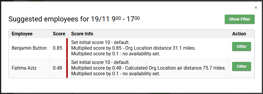 When you click, you will see a popup with some suggested employees for the shift. These suggestions are based on many different parameters with specific scores assigned to them.